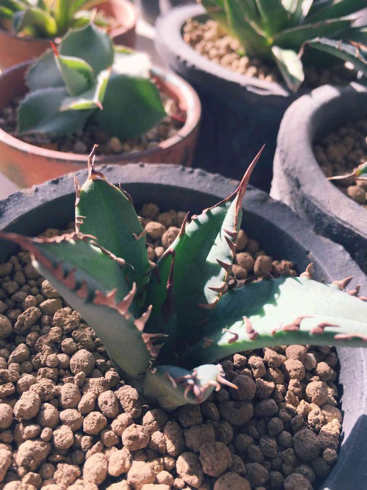 アガベの小さな小さな仔株、10月に外で霜にあたって萎びたの。茶色くなって枯れたと思っていたら、中から青い芽が🌱! やっぱり、アガベ強いね〜〜。