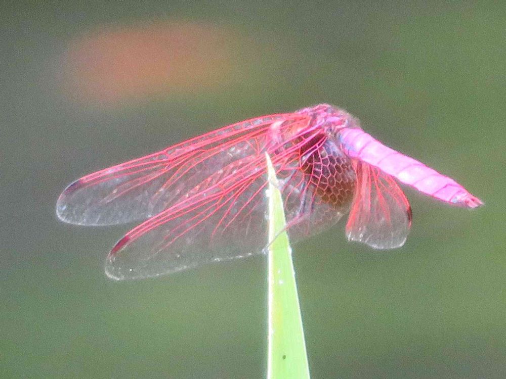 体が真っ赤なトンボにはちょくちょく出会ってますが、羽根まで色つきで、鮮やかなピンクのトンボは私も初めてです😍💕なんて綺麗なトンボでしょう🥰💕💕