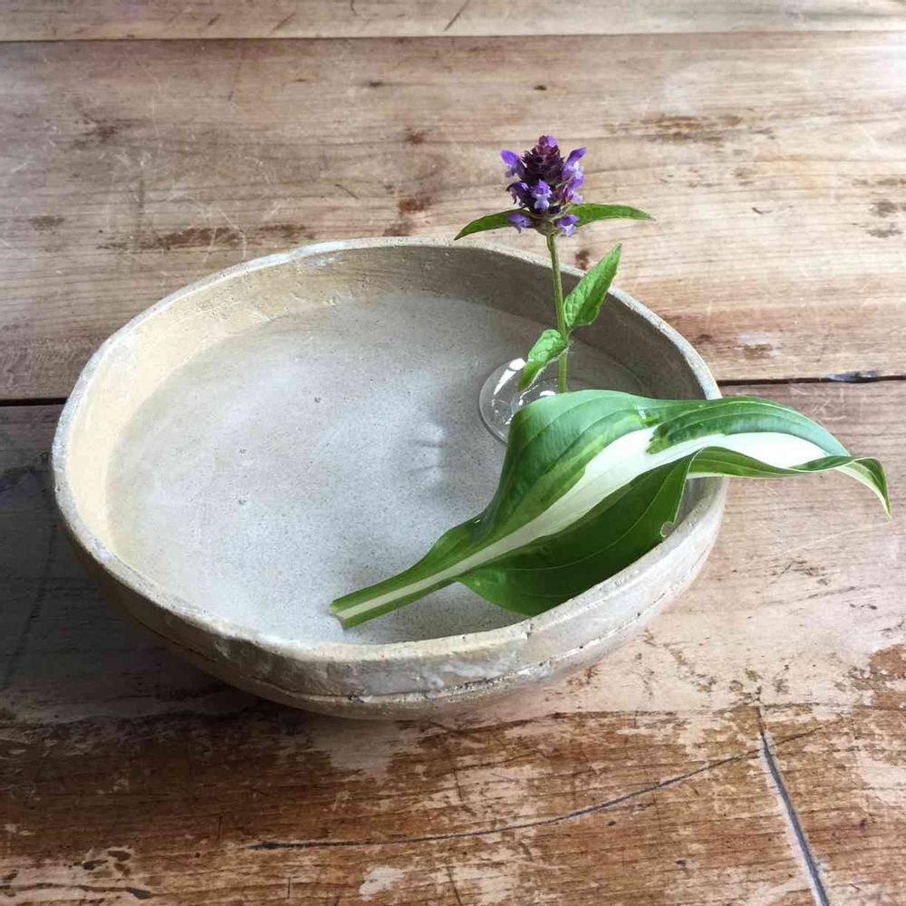 ギボウシと、繁殖していた紫の花を自作の器に生けてみました。