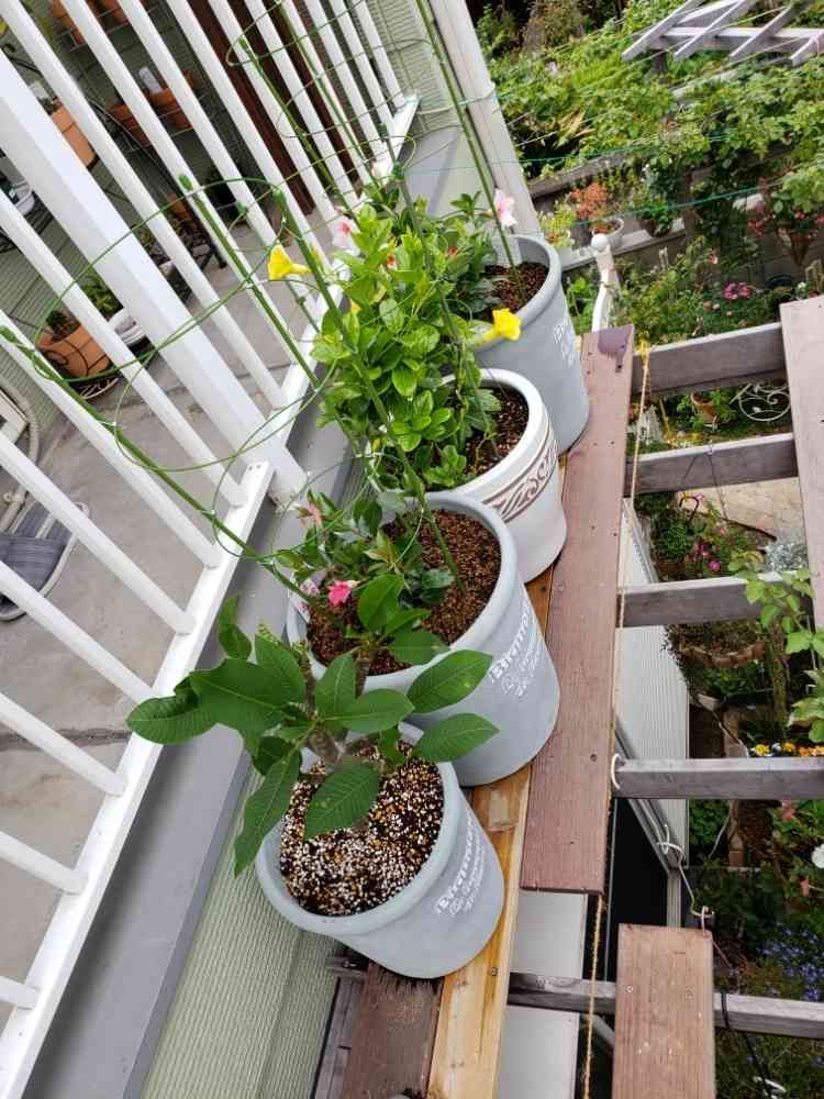 ほかのブルーの大きなテラコッタ鉢には、マンデビラを今日、このバーゴラの上で、植え替えをしました。
