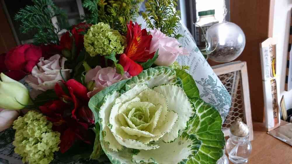 葉牡丹入りの花束。新種のバラも。どんな風に咲くのでしょう?