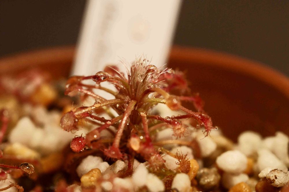 ドロセラ ソラリス(Drosera solaris)、南米ギアナに自生する小型のモウセンゴケです。立ち上がるタイプのようで、天辺の成長点の部分が白い毛で覆われています。これも10月にチェコに注文して、11月に来たモウセンゴケの1つです。