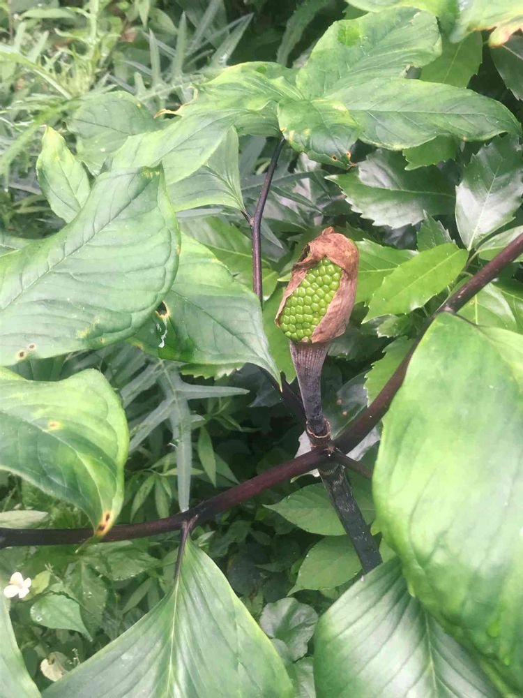 少し前は青々していたマムシグサ 、緑の実が出来ていました。
