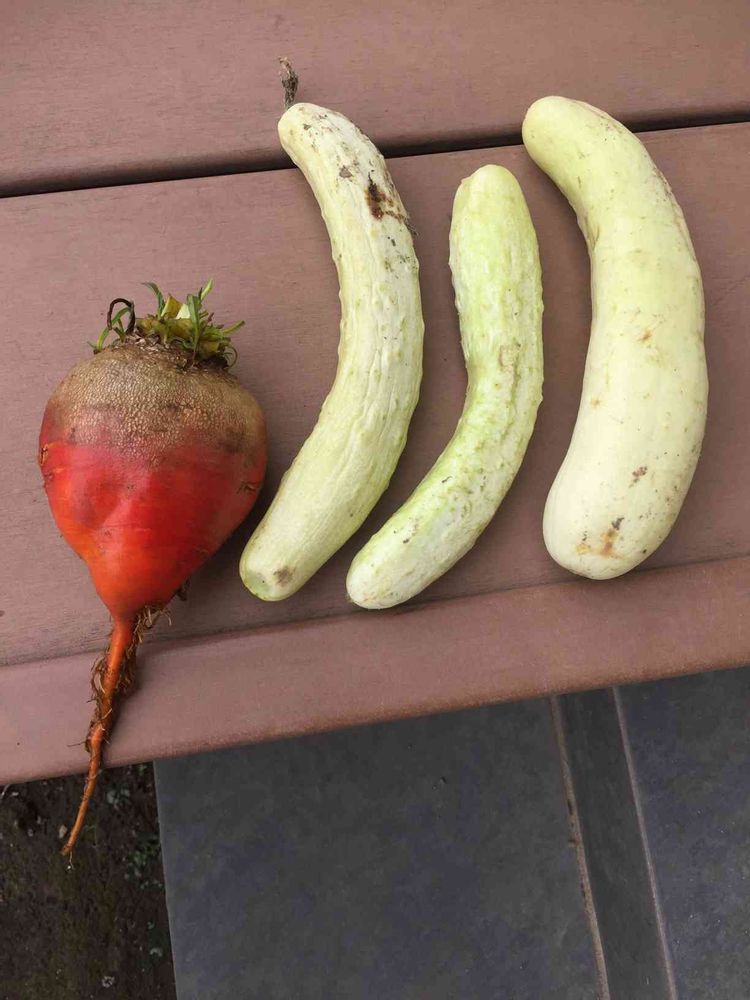 白い胡瓜と1つだけ収穫出来たオレンジのビーツですよ。