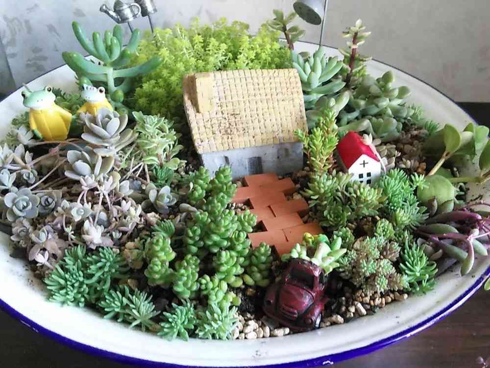 ホーロー洗面器にセダムの森😊