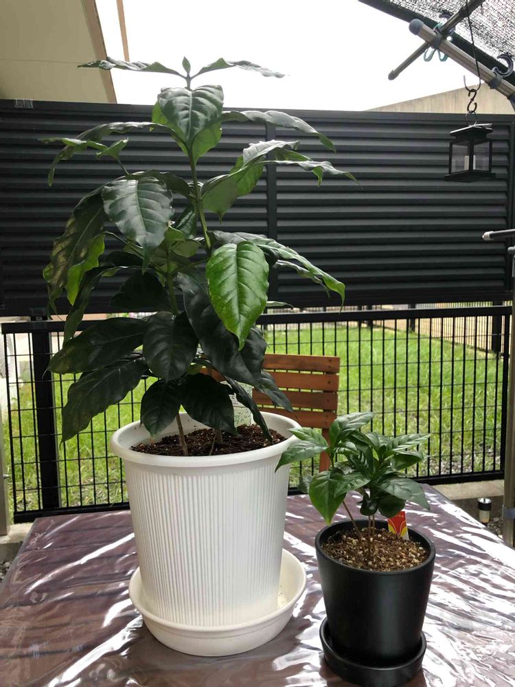 大きなコーヒーノキと小さなコーヒーノキ。ドンドン育ってます。