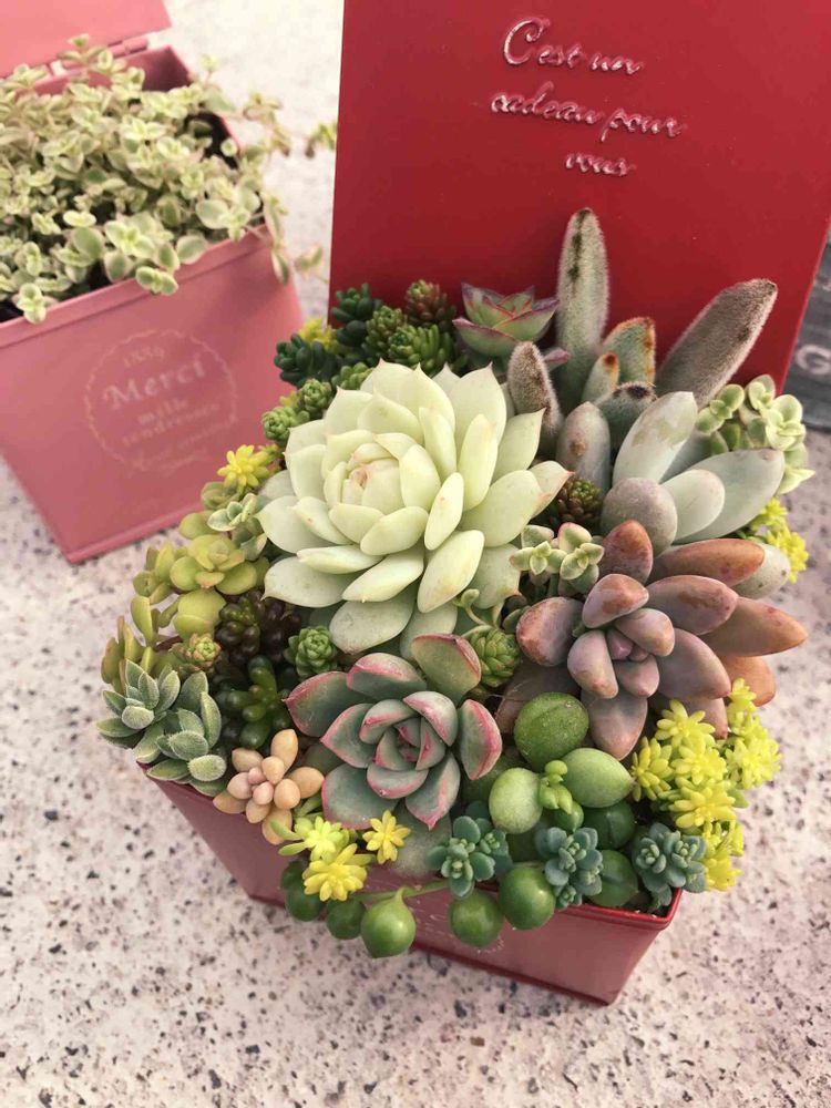メインの多肉ちゃんを1つ選んでもらってあとゎ小さい多肉ちゃんを4つ選んでもらって星さんを1カット、レッドベリーを1カット、セダム…