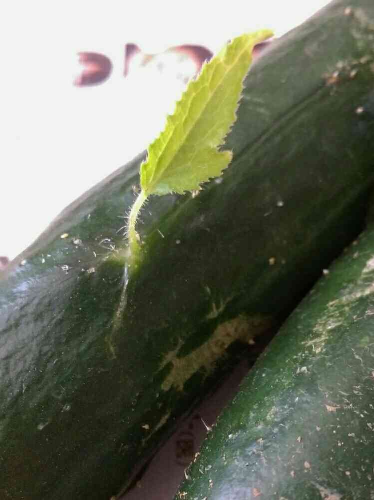 うちの畑で採れたキュウリから小さな葉っぱが生えてました。こんなキュウリが出来たのは初めてです。