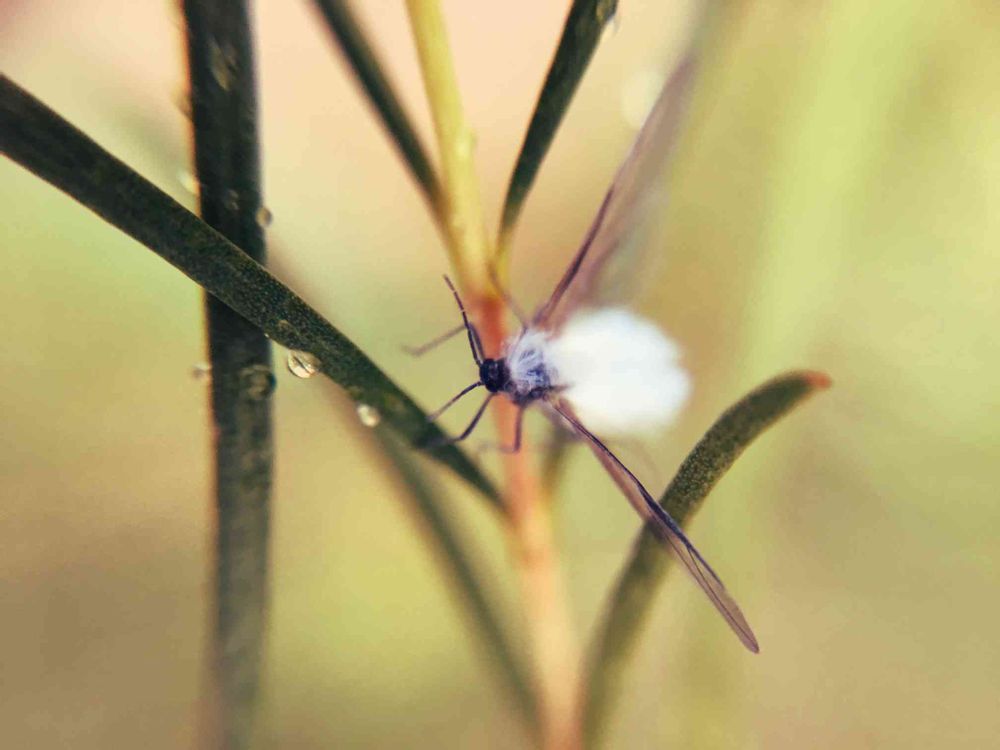 昼間、ワックスフラワーの枝に雪虫がとまっているのを見つけました✧‧˚