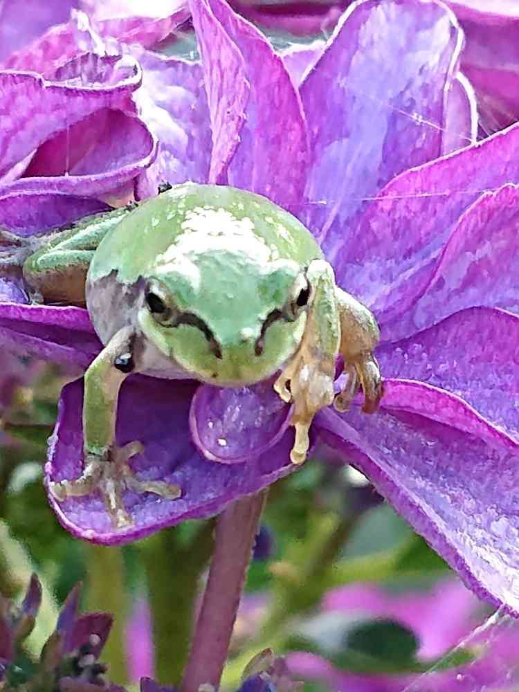 うちもアジサイに乗ってたのよ😁平ペッタイ変な蛙🐸で鳴き声はやたらデカい👂⚡