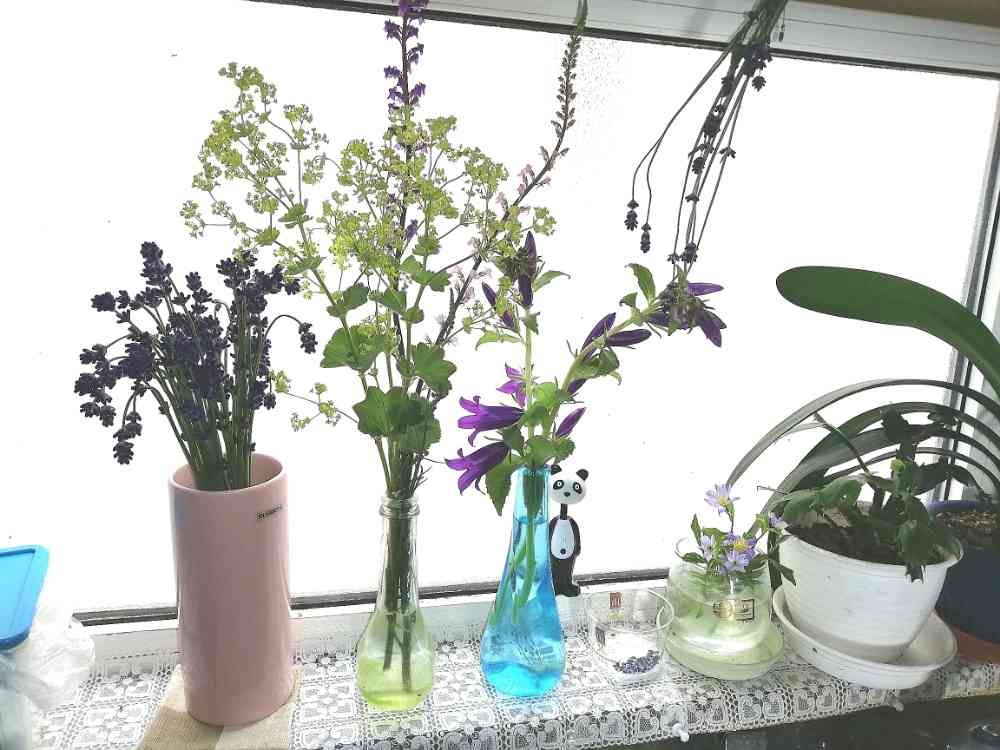 今朝の涼しげなキッチンの窓辺の花達🥀