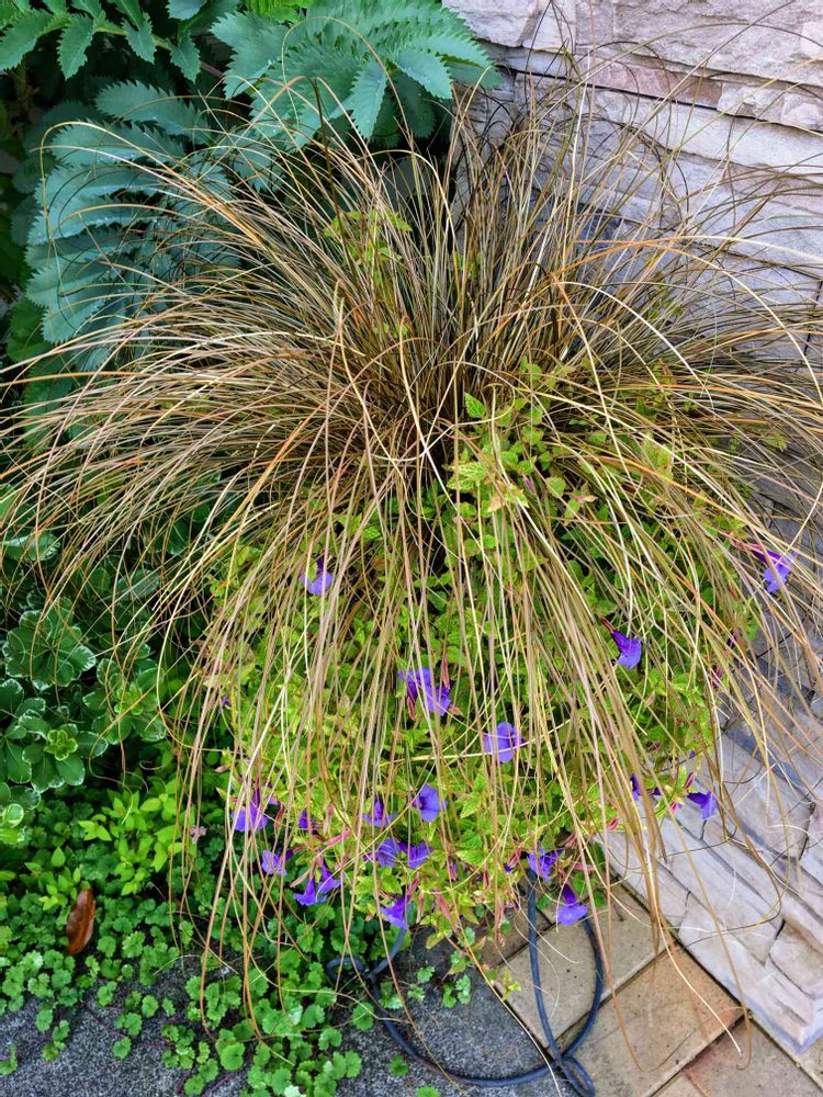 置き所が定まっていないカレックスとトレニアブルーインパルスの寄せ植えです