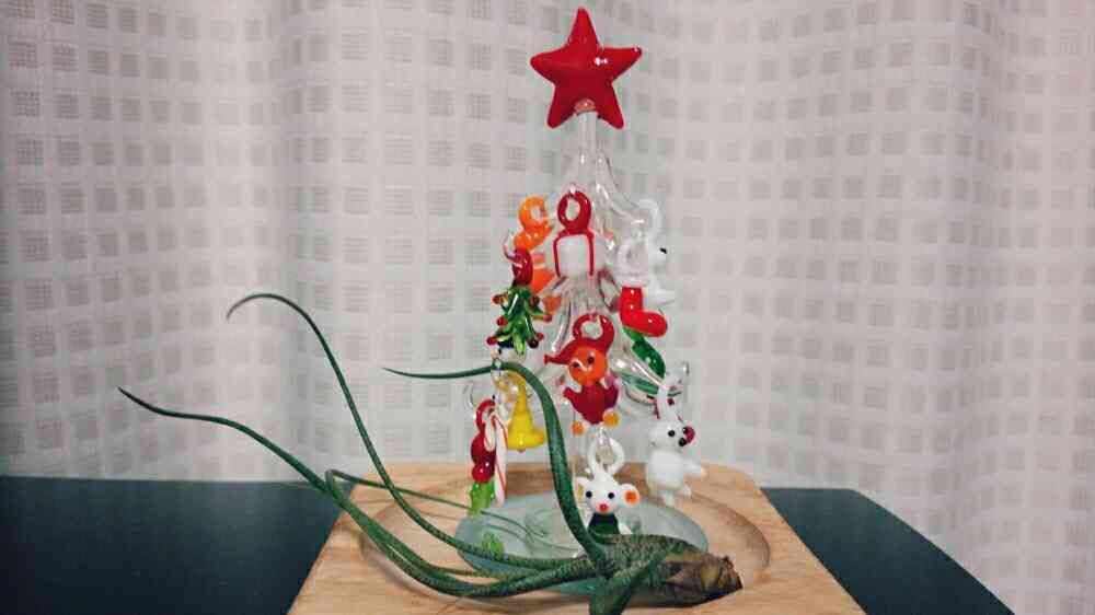 小さなクリスマスツリーの前にエアプランツを置いてみた。😄