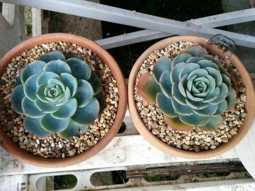 カイガラムシにやられて小さくなった右の七福神(高咲蓮華)と、3代目インブリカータ(インブリケイタ)