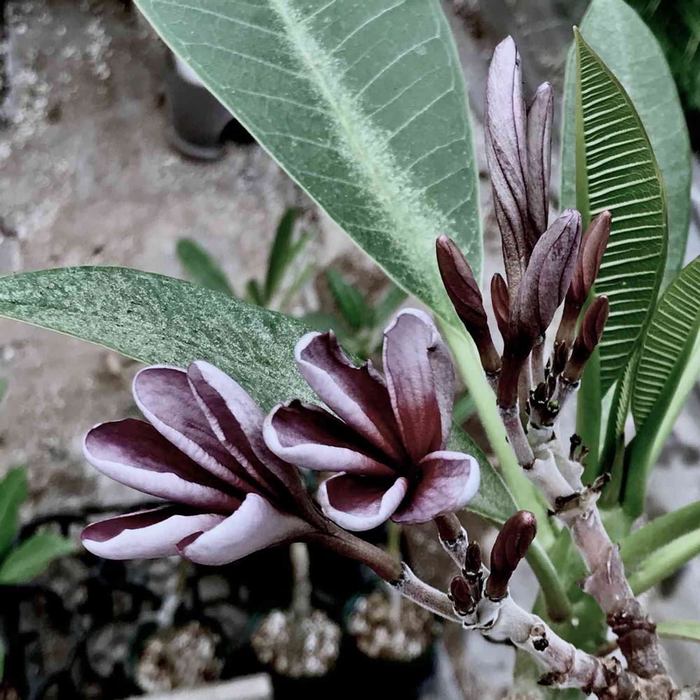 世にも不思議なグレー色の花を咲かせるプルメリア、Seedling Sa-ngiam #5が咲き始めましたよ〜🌴