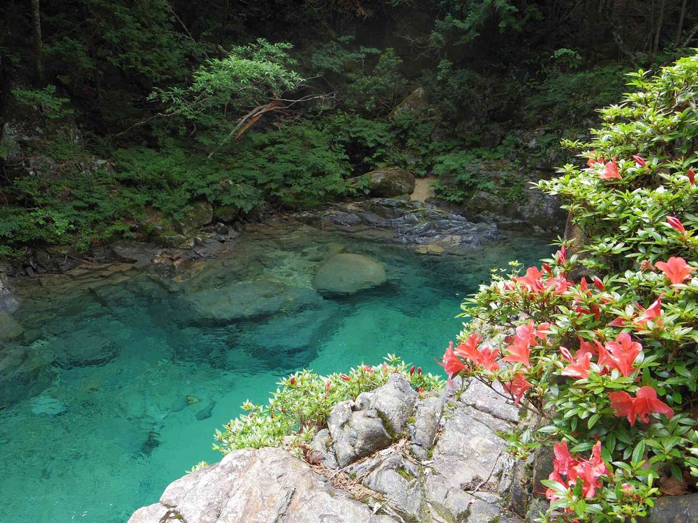 きれいですね~。すいこまれそうな川のいろ!岩ツツジの赤が河面によく映えて。広島にも、三段峡とか帝釈峡とかあるけど、長くいってないなあ。