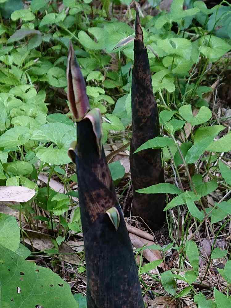 真竹(マダケ)あがりだしました横にはマムシソウも今は赤、モソウダケのときは