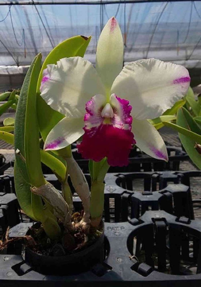 本日ご紹介はミディカトレア ヒノモト。ミディの中でも一輪のサイズが大きく背丈も40センチほど。コンパクトな姿が凛々しい子です。