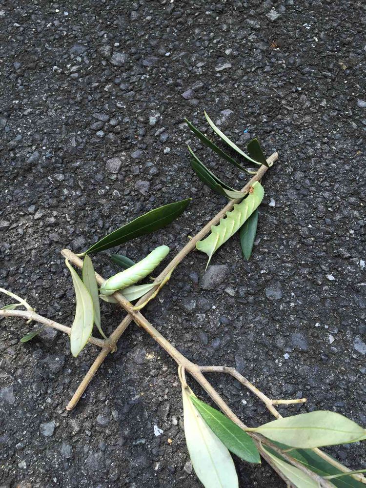 オリーブについてたスズメガの幼虫、枝ごと切って庭の端に投げ捨てたんですが、写メを見た同僚が育てたいって!明日の朝探さなきゃー!