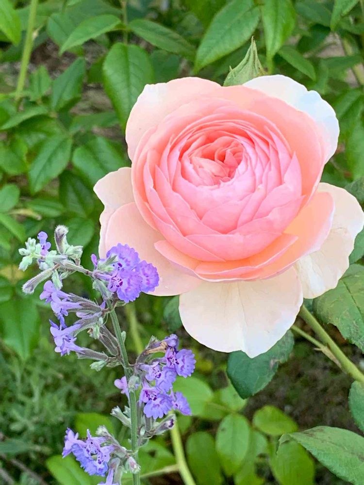 うちのバラはピンクばかりなので、白か青のお花をくっつけたいです。