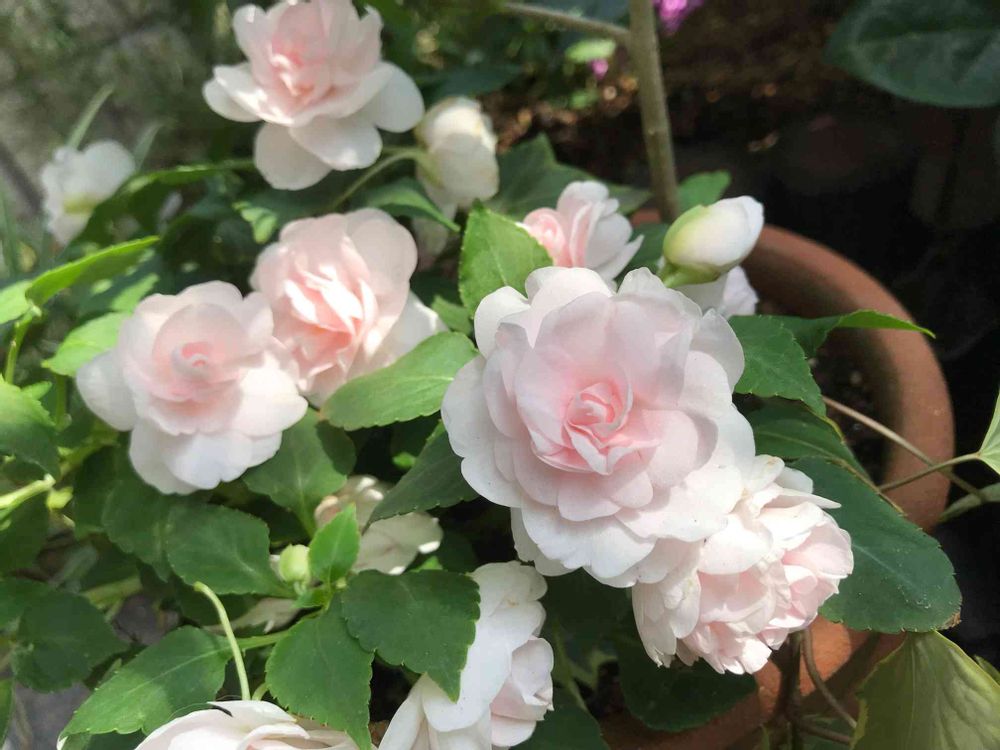 寄せ植えの八重咲きインパチェンスシルエットアップルブロッサムをアップで😍💕