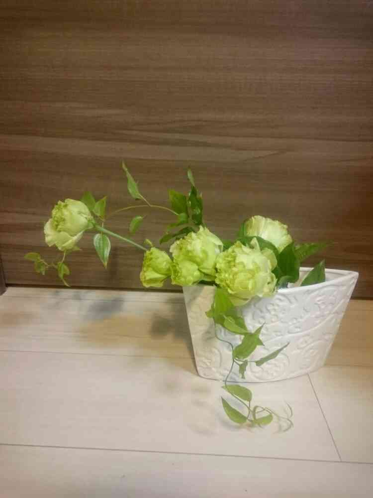 緑一色の生け花はとても難しそうですが、白の花器にとても映えていてステキです。利休草のツルの動きも面白いです、お家で育てているのですか?🌿