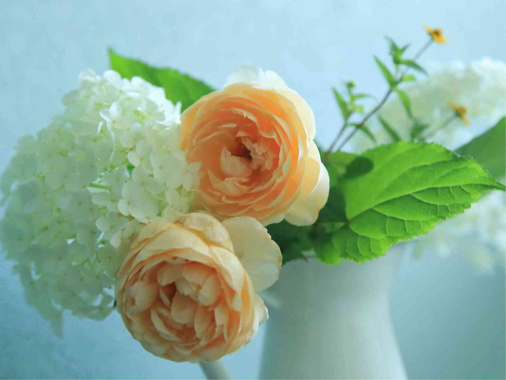 うちのアナベルもバラもちょっと小ぶりなので、切って花びんに入れるだけで可愛い感じになります💕