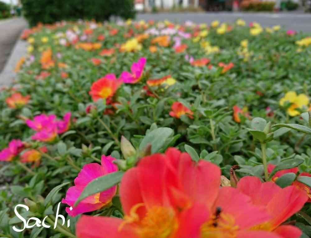 メイン道路の舗道の花壇に色とりどりの「ポーチュラカ」が…