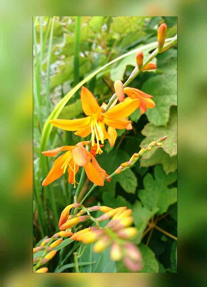 ♣ヒメヒオウギズイセン(姫檜扇水仙)、またはヒメヒオオギズイセンは、アヤメ科ヒオウギスイセン属(クロコスミア属)の雑種。園芸ではクロコスミア、または旧学名のモントブレチアの名前でも呼ばれる♣
