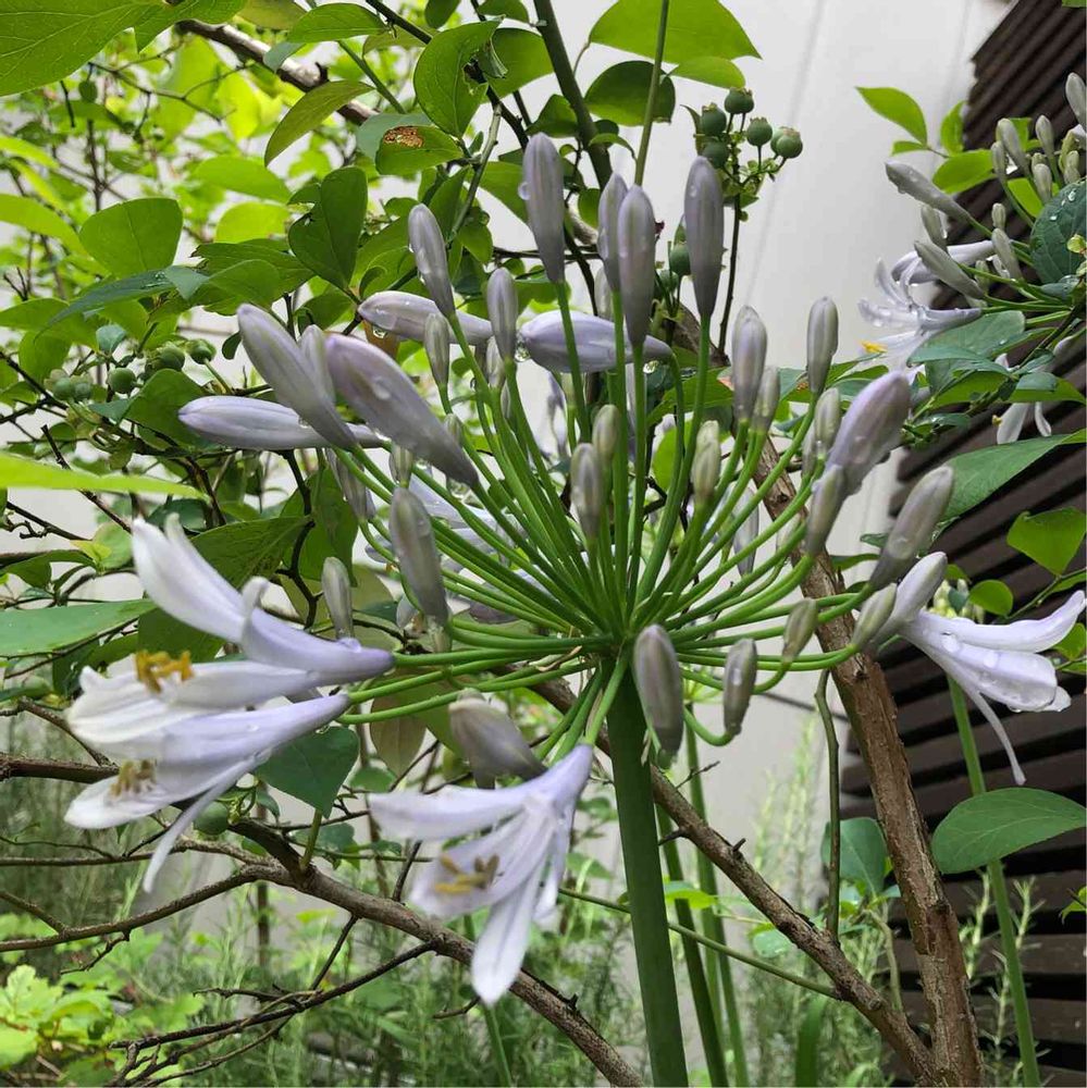 ブルーベリーの木の下でアバガンサスが咲きました。梅雨の鬱陶しいこの季節に爽やかな色。