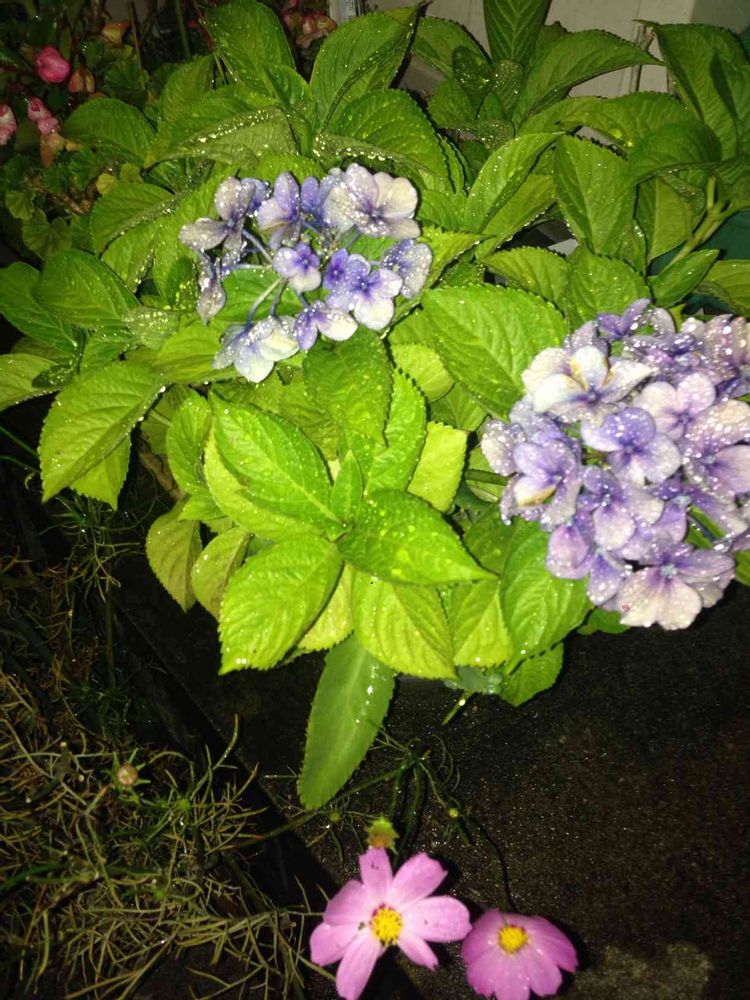 紫陽花、手前は季節外れのコスモス