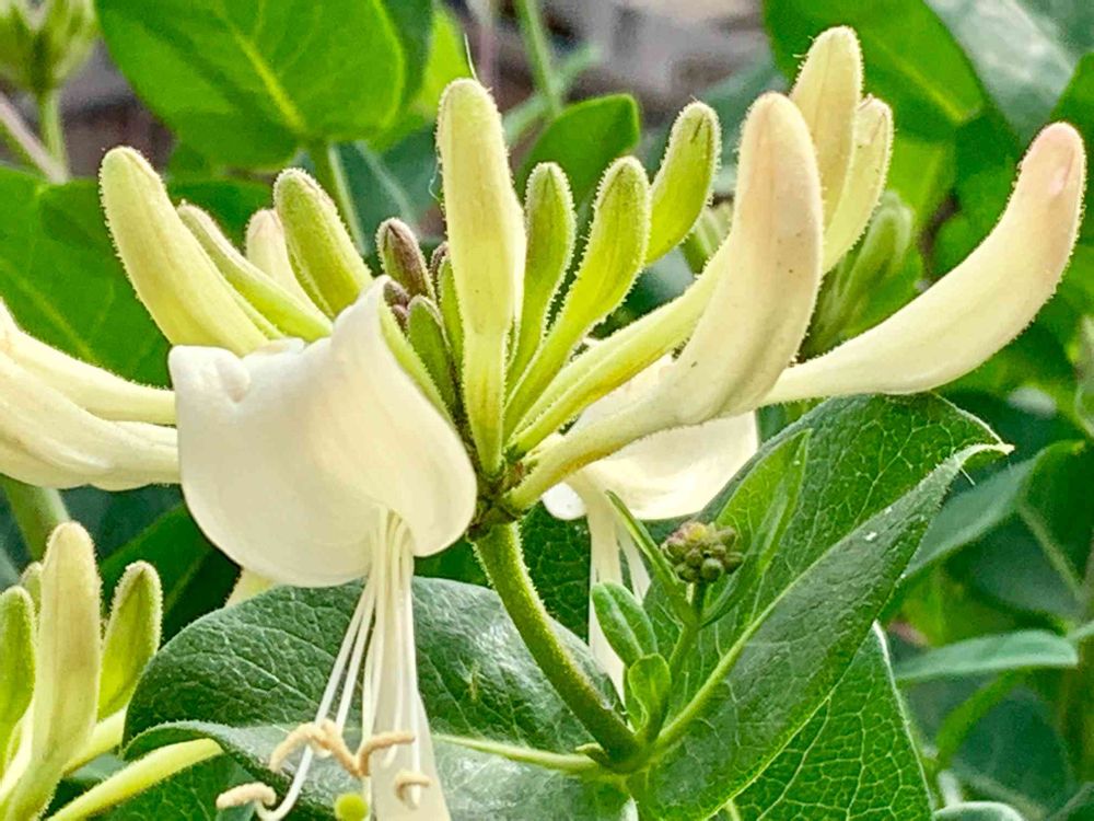 凄い勢いでつるが伸びていきます。甘い香りが強くて、蜂も飛んできます。爽やかな色合いが好きです。ハニーサックル。