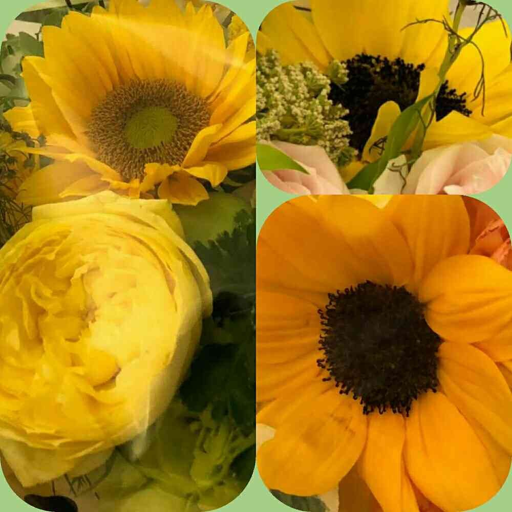 これらは実は近所の中1の女の子のバレリーナの発表会で頂いたアレジメントの🌻🌻🌻季節がら🌻が多くてとpic を送ってくれたのを編集しました