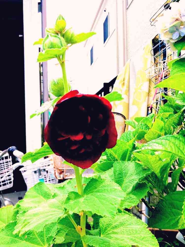 逆光で綺麗に取れなかったけど、立葵開化1号💕