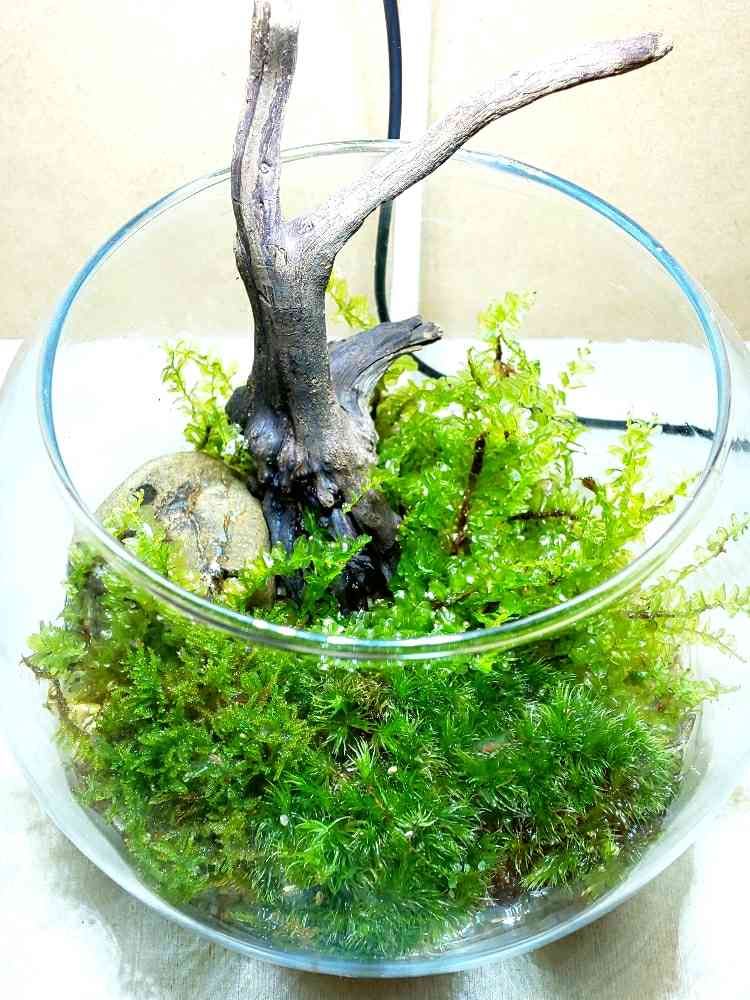 容器はダイソーで200円。採取したシッポゴケ?とウィローモスを置いて、コツボゴケを1本ずつバラして植え込み。