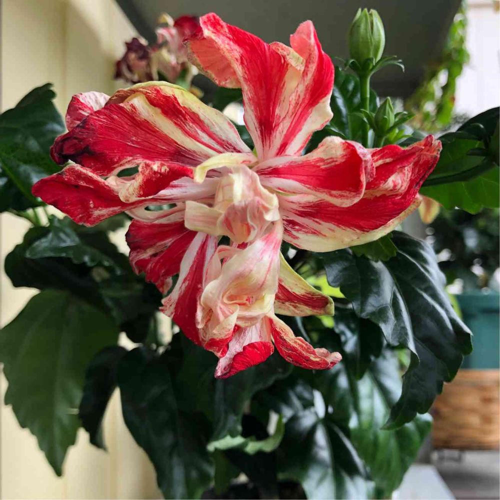 ハワイアンフラッグが咲きました。確かにハワイ州の旗のシマシマみたいだ!ハイビスカスのネーミングはとても楽しいです(๑′ᴗ‵๑)