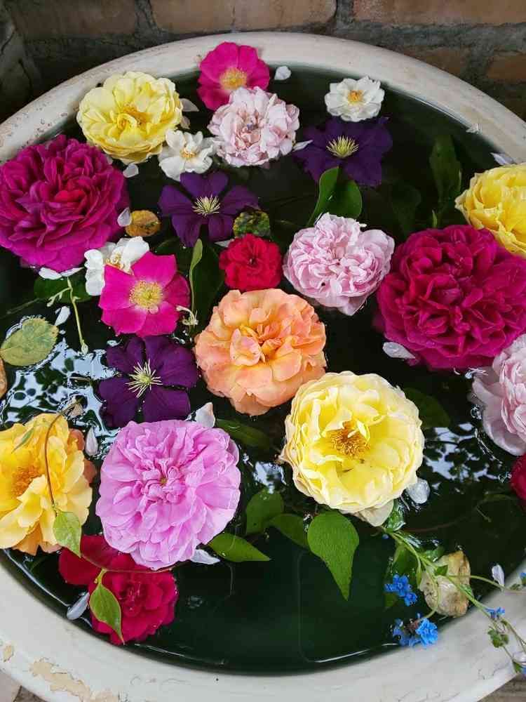水盤に色とりどりのバラとクレマチス*✲゚*。 ♪