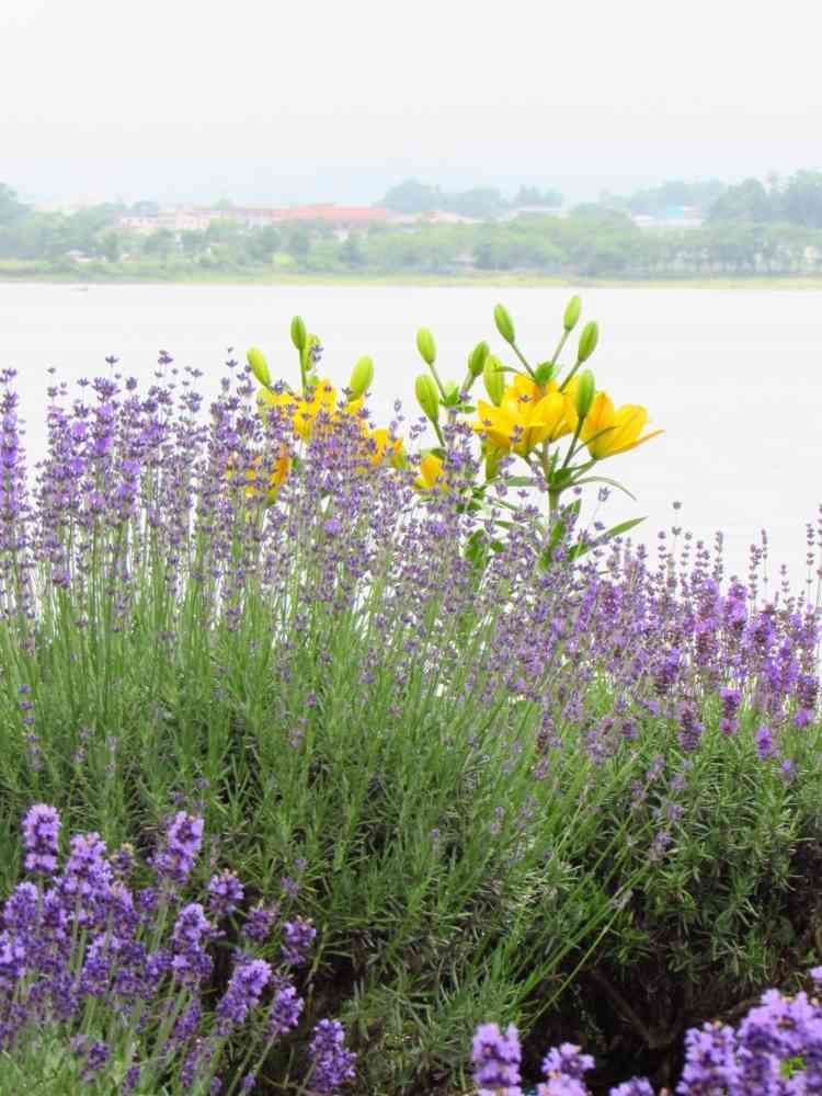 グレーの湖面に、立派なユリとラベンダー、そして緑の色合いがなんとも優しかったです🎵