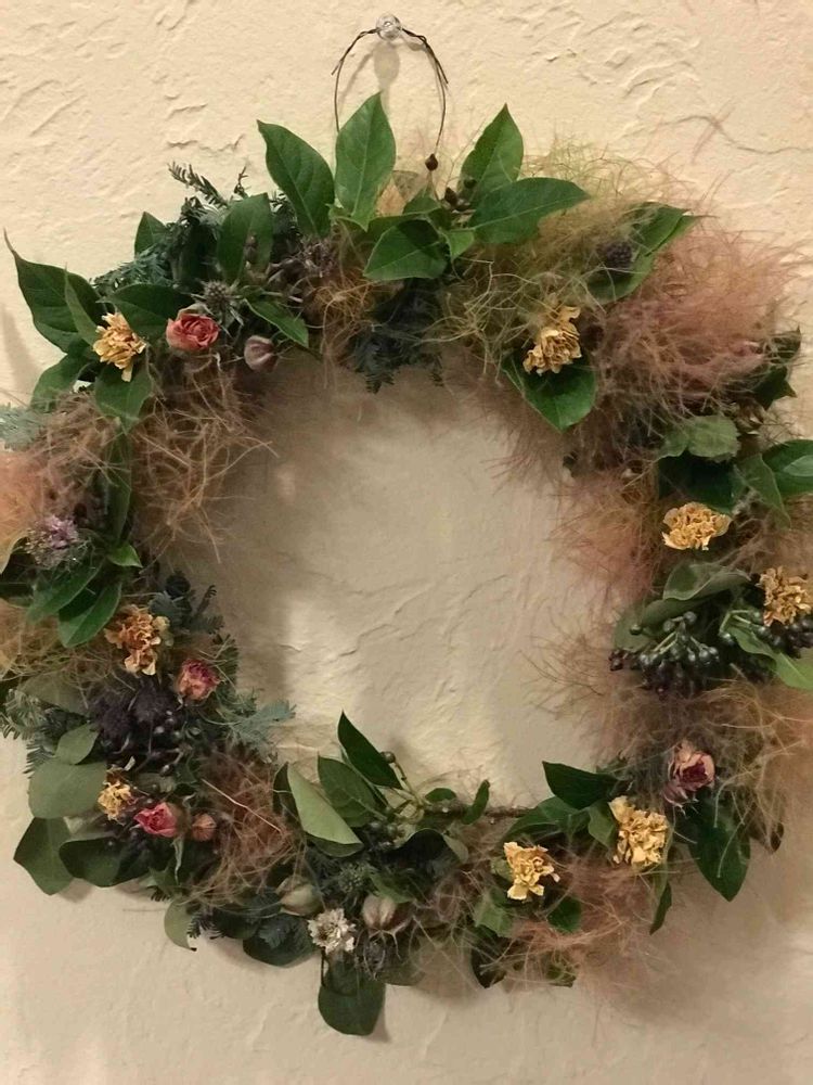 昨夜、スモークツリーのリースを作ってみました。グリーンが多めのものになりました🌱ミニバラ、カーネーションなどの自作ドライを添えてみました。部屋の中の雰囲気ぐ変わりました💕