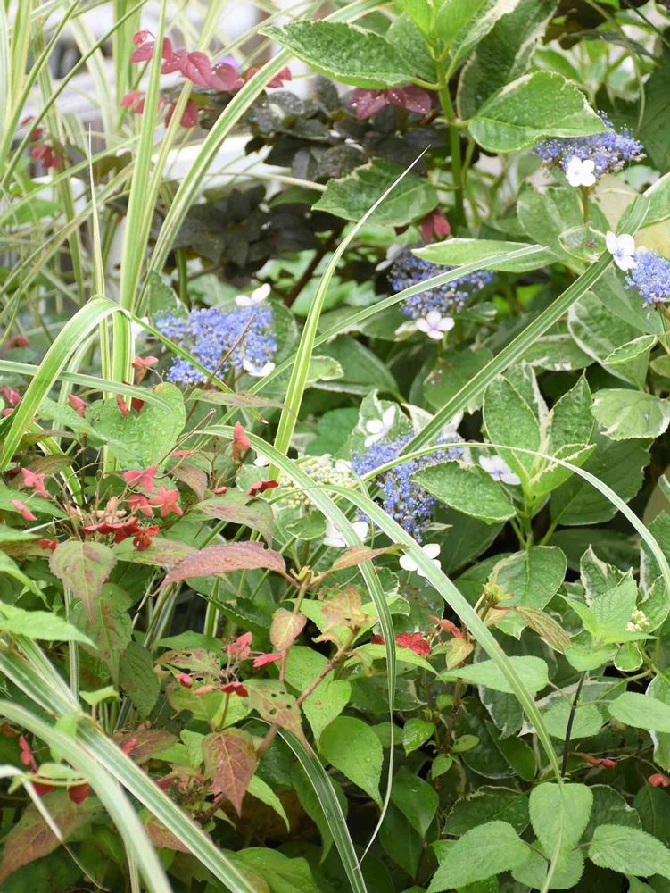 手前の赤いアジサイは紅です。後ろは斑入り葉のガクアジサイ、後ろの濃い色の葉はアカバナトキワマンサクです。