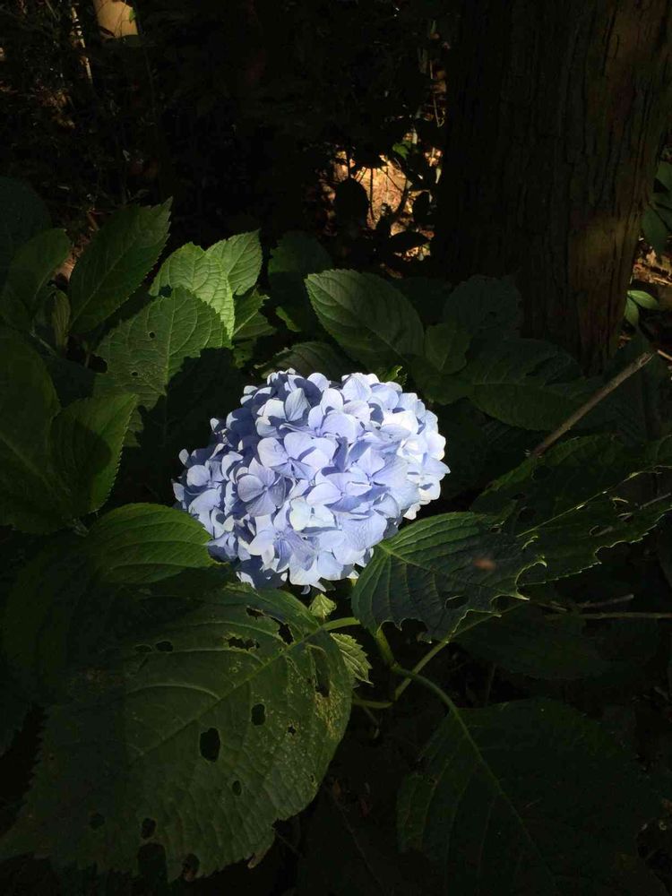 山に咲くアジサイ。木々の合間から差し込む光に照らされて。