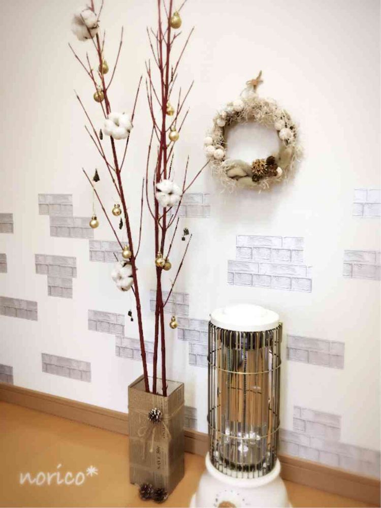 お花屋さんで見つけた枝ものに100均の飾りと綿の実を飾りつけ♡
