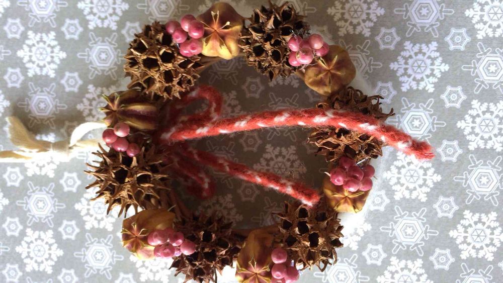 自然の木ノ実と、ピンクのペッパーベリーを使ってリース作製❣️