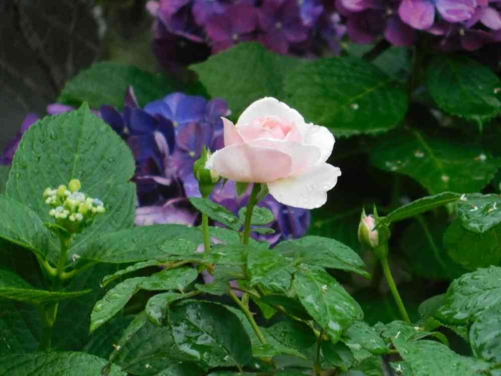 紫陽花を背負って咲くオリビアさま。