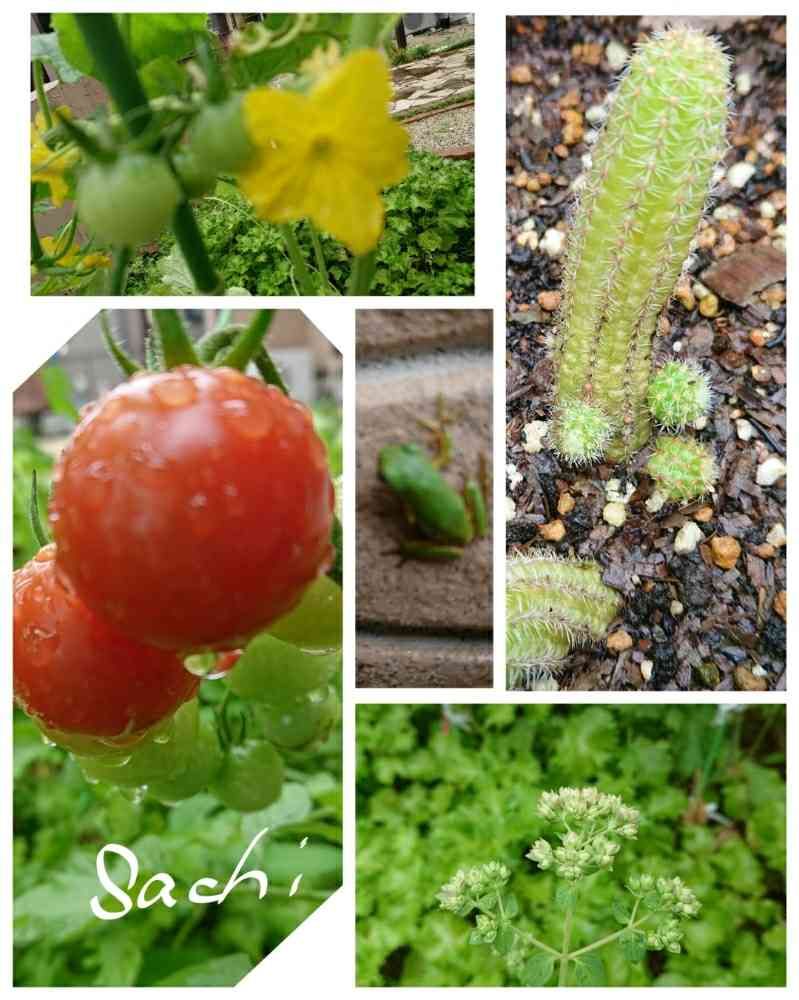 今日の庭🎶サボテンに子株が付いてた👍オレガノはもうすぐ花が咲きそうです😃キュウリの花トマト…🐸ちゃん