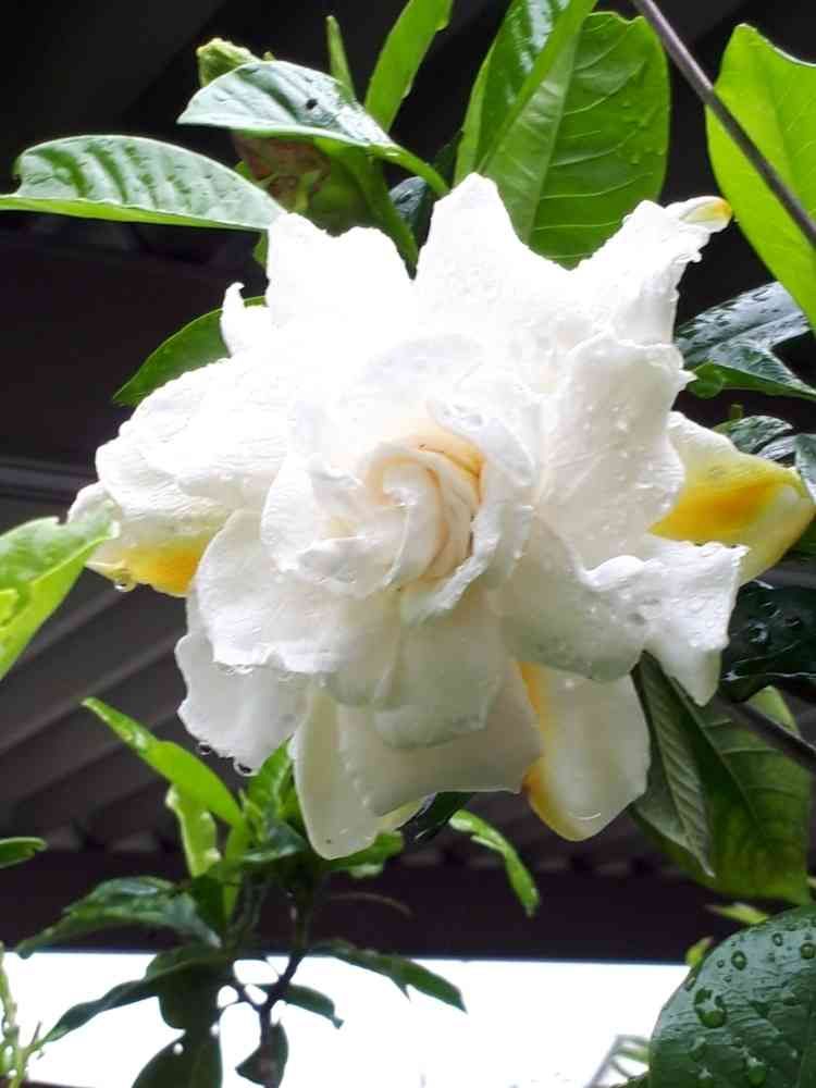 雨の中、やっと咲きました。八重咲きくちなしの一番咲き。