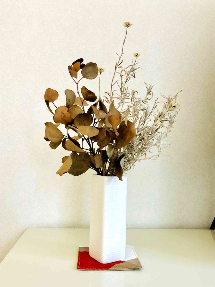 剪定したユーカリとヘリクリサムをドライフラワーにして、百均で買った花瓶に飾ってみました😊