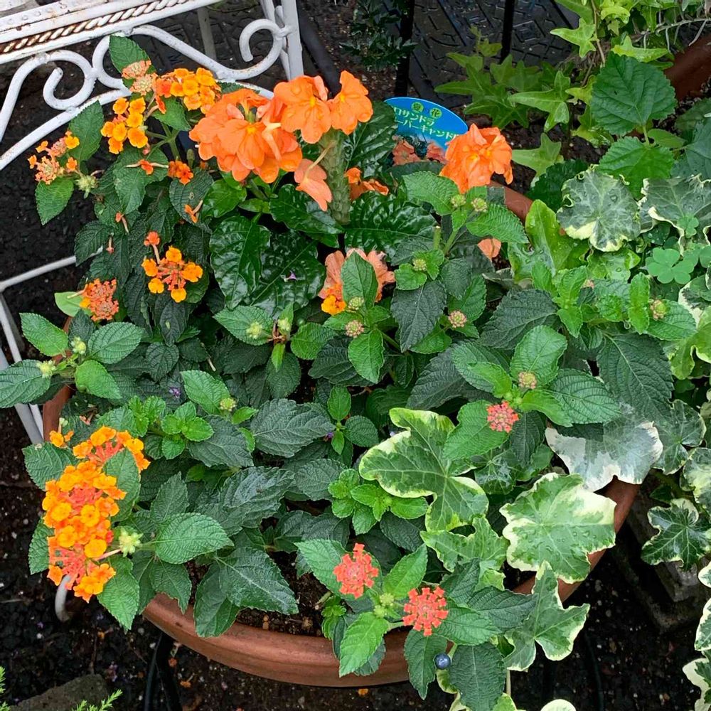 クロサンドラスーパキャンドルをバーベナリギダとへデラの寄せ植えに加えて見ました。
