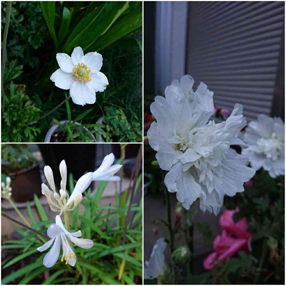 白い花を三種。アネモネ、アガパンサス、アオイ・・・ナ、ナント頭文字が「ア❗」だったりして😄。