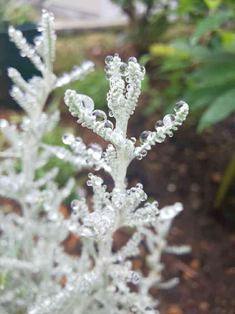 サントリナ、雨粒を纏ってまるで海ぶどう状態💧